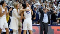 Connecticut head coach Geno Auriemma, right, reacts as Connecticut’s Gabby Williams (15) is congratulated by associated head coach Chris Dailey and embraced by assistant coach Marisa Moseley at the end of an NCAA college basketball game against South Carolina, Monday, Feb. 13, 2017, in Storrs, Conn. UConn won their 100th straight game.