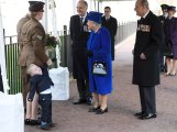Michelle Lun, left, holds on to her son Alfie, 2-years-old, as they meet Britain's Queen Elizabeth II at the unveiling during of a national memorial honoring the Armed Forces and civilians who served their country during the Gulf War and conflicts in Iraq and Afghanistan in London, March 9, 2017. Britain's Prince Philip stands at right.