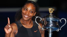 Serena Williams poses with the Daphne Akhurst Trophy after winning the Australian Open women's singles final against her sister, Venus Williams, at Melbourne Park on January 28, 2017.