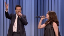 Anne Hathaway and Jimmy Fallon take turns singing songs that have been translated by Google, such as The Weekend's "Can't Feel My Face."