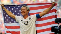 United States' Abby Wambach holds up the U.S. flag as she celebrates after the U.S. beat Japan 5-2 in the FIFA Women's World Cup soccer championship in Vancouver, British Columbia, Canada, Sunday, July 5, 2015.